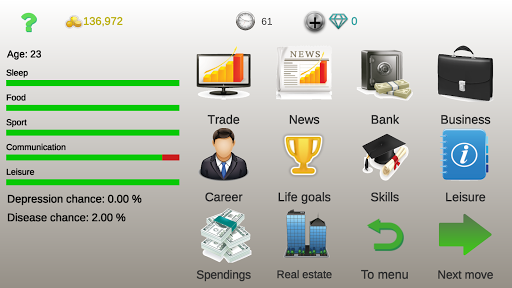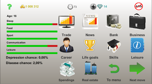 I really wanted to like this game - it has a basic idea and solid gameplay. However, once I was balanced with my life stats and making money, the game became a complete slog. By age 20, I had maxed out my stats and thought about attending university, but I dreaded the prospect of tapping through four years of turns with nothing much happening. Likewise, tapping through multiple menus every turn to invest or start businesses didn't seem much better. Maybe Business strategy 3 will be better.