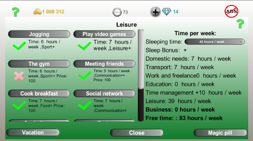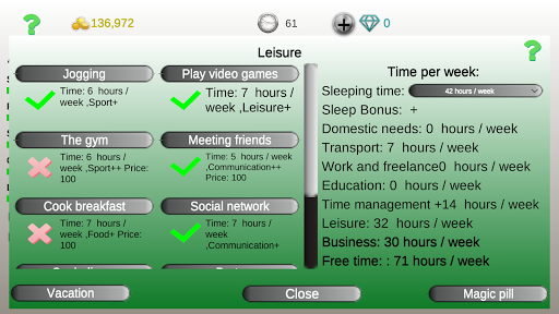 It looks like it could be a good game if it was playable... Rn you can't play it Right from the beginning my character gets depressed every second turn, making it impossible to advance, especially annoying because 25% is not 50%... I had all leisure and communication things on, so no free time, yet depression percentage kept going up. You can only play if you spend money, but they don't even give you the chance of seeing if it's worth spending any money onπ. Pity