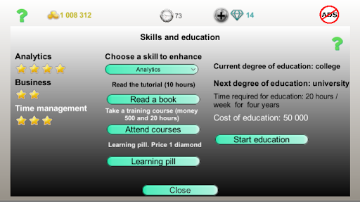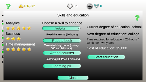 I don't usually leave reviews, but, this is a great game dude! Has among the best investing experience in Google Play games. The concept is well layed-out, it just has to be perfected - the business path has to be more viable and understandable, as well as more career opportunities (e.g. academic career, lawyer, etc.). With those and perhaps even a better graphics, I see no reason why people wouldn't pay for it.