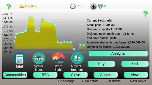 Initially gave it a 5 start, but the third time I tried to finish the game (with a third strategy) it's very clear that when you own multiple stocks in a company or when you own lots of commodities, the price of what you own will gradually go down and what you don't own (or own a little) will go up forever... A little frustrating... All in all a good game, but don't expect you'll do better your second or third time...