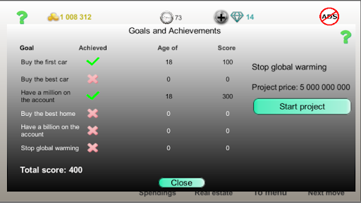 Update 2: Finished it last night at age 62, though could have done it at 50+ age if only I read it right. I thought it was 50B to stop climate change hahaha. It was fun until you master the three skills of the character and get the best position and degree but it became silent when I was about 25, not much to do anymore rather than go for real estate. I'll email you the two glitches I've seen too. The game only has a pretty high learning curve but it's a nice alternative for cashflow 202. π