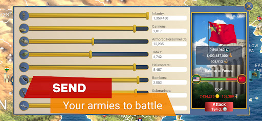 Annoying P2W game. Getting military other than your starting one is impossible, getting enough food is impossible, science research technology barely does anything, you can't attack any countries, atleast if you don't want the whole world to declare war on you later and drain your army since, again, it's very hard to even get it back and if you don't wanna be attacked, you need to give them your army or money that you use to build it. It also costs money to even send your army, not worth the ti
